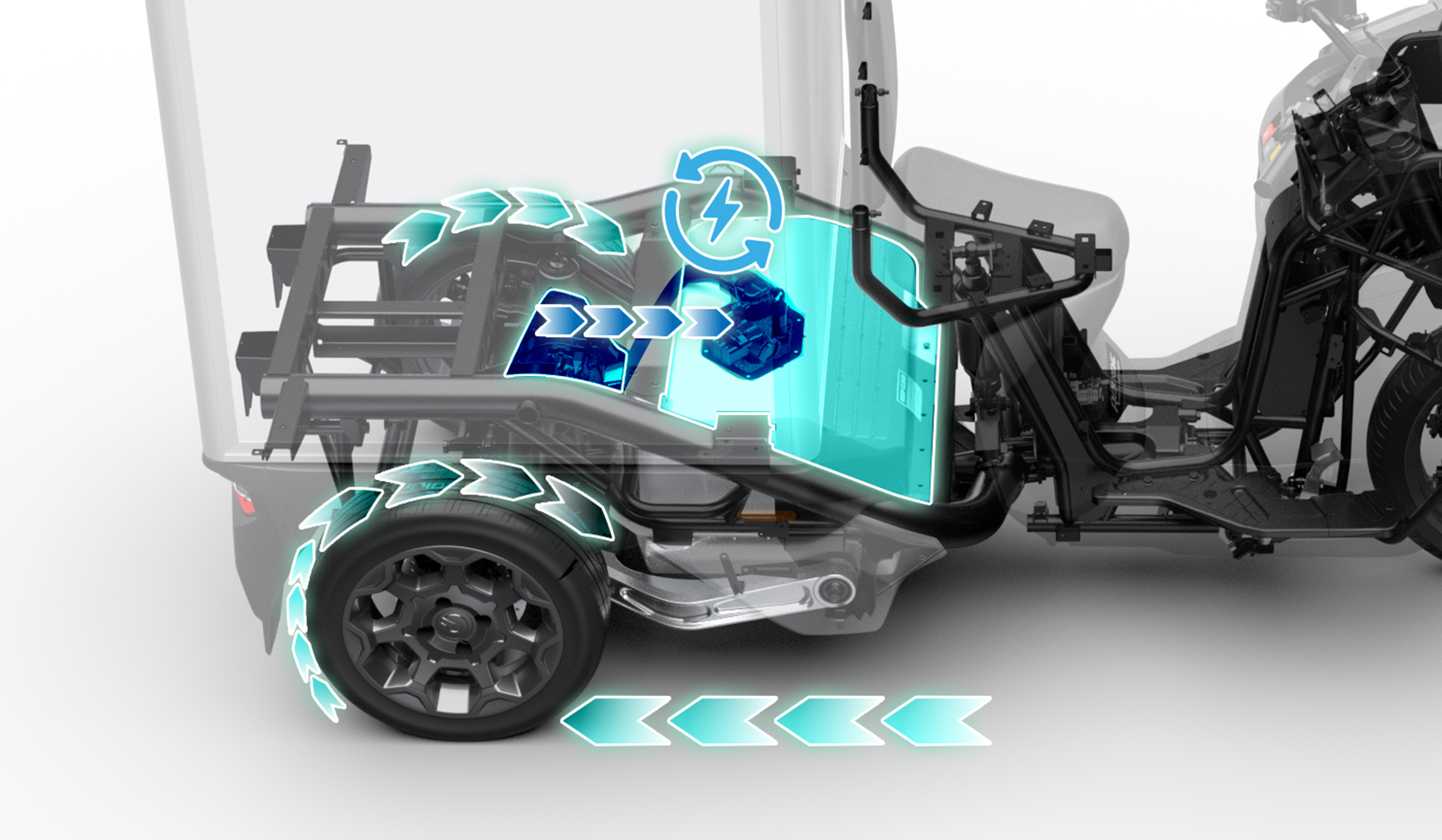 前後三輪すべてにアンチロックブレーキシステムを搭載。緊急ブレーキ時のホイールロックを防止し、制動距離を短縮します。またブレーキ時 のタイヤ摩耗を軽減し、タイヤの寿命も伸ばし、走行の安全性を向上させます。
